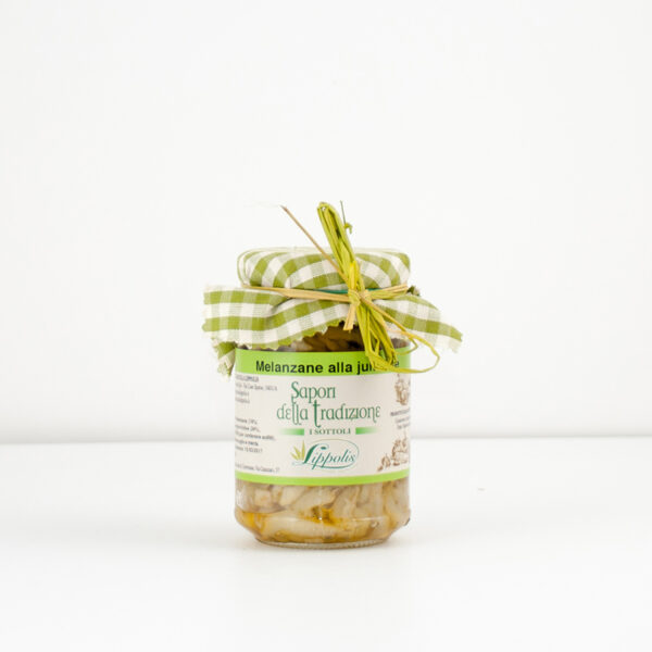 Ingredienti: melanzane (74%), olio extravergine di oliva Lippolis (24%), aceto di vino, succo di limone aglio e menta.